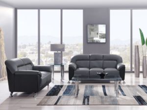 Curl up and get comfy on this contemporary two tone leather-like sofa. Featuring smooth two-tone upholstery of black and gray leather-like material, a double pub back, and chrome accent legs, this living room will make the perfect addition to any modern living room. The sofa has plush cushions, providing you with a comfortable place to sit while you watch television, read a book, or just kick back and relax. This love seat is sure to be the focal point of any modern decorated room. Curl up and get comfy. This cushy chair is perfect for kicking back and relaxing in, or curling up with a good book or movie.