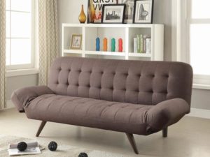 This sofa bed and futon has a silhouette and styling that stands out in any room in the home. It has a kiln-dried hardwood frame and solid wood legs crafted for durability. It is luxuriantly upholstered in tufted mink grey woven fabric. Armrests adjust to accommodate your head or feet as well. Relax or recline on the supple spring decking complete with high-density foam for maximum comfort.