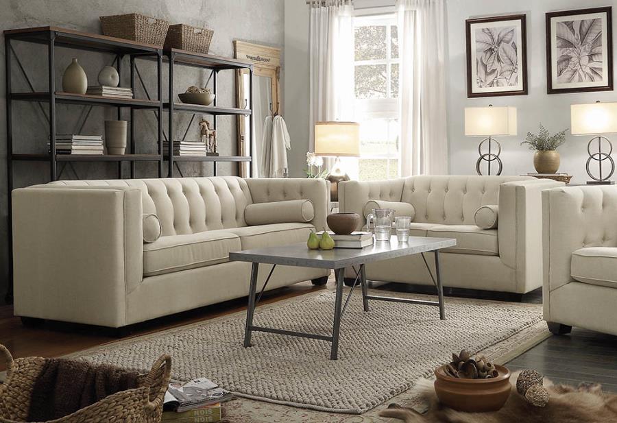Relax in this sofa after a long day. This piece has tuxedo track arms with inside tufting and an attached back with the same tufting, creating a regal look. Other features include decorative tufted back and comfortable lumbar pillows, reversible seat cushions, and block wood feet.